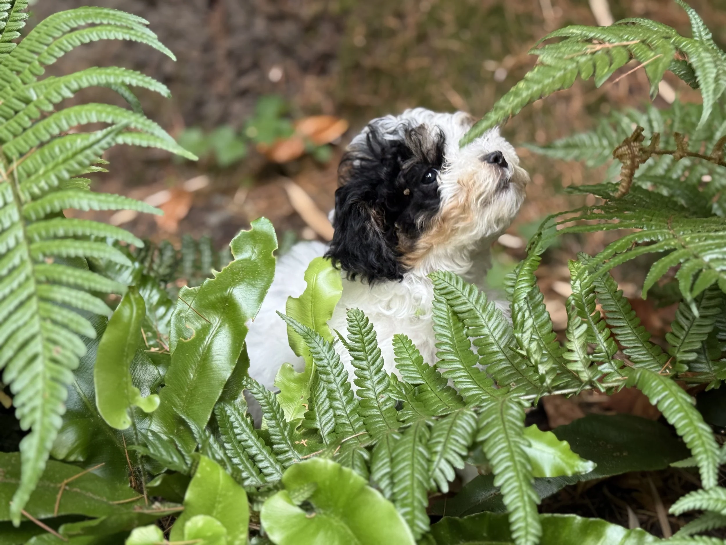 This adorable fluffball comes pre-programmed with jungle explorer mode activated—as you can see, they've already mastered the art of camouflaging among ferns and looking photogenic while doing it. With their tuxedo-style black and white coat and that signature "I just discovered something amazing" expression, this little adventurer is ready to turn your backyard into their personal safari. Warning: May cause uncontrollable cuteness overload and sudden urges to buy tiny hiking gear.